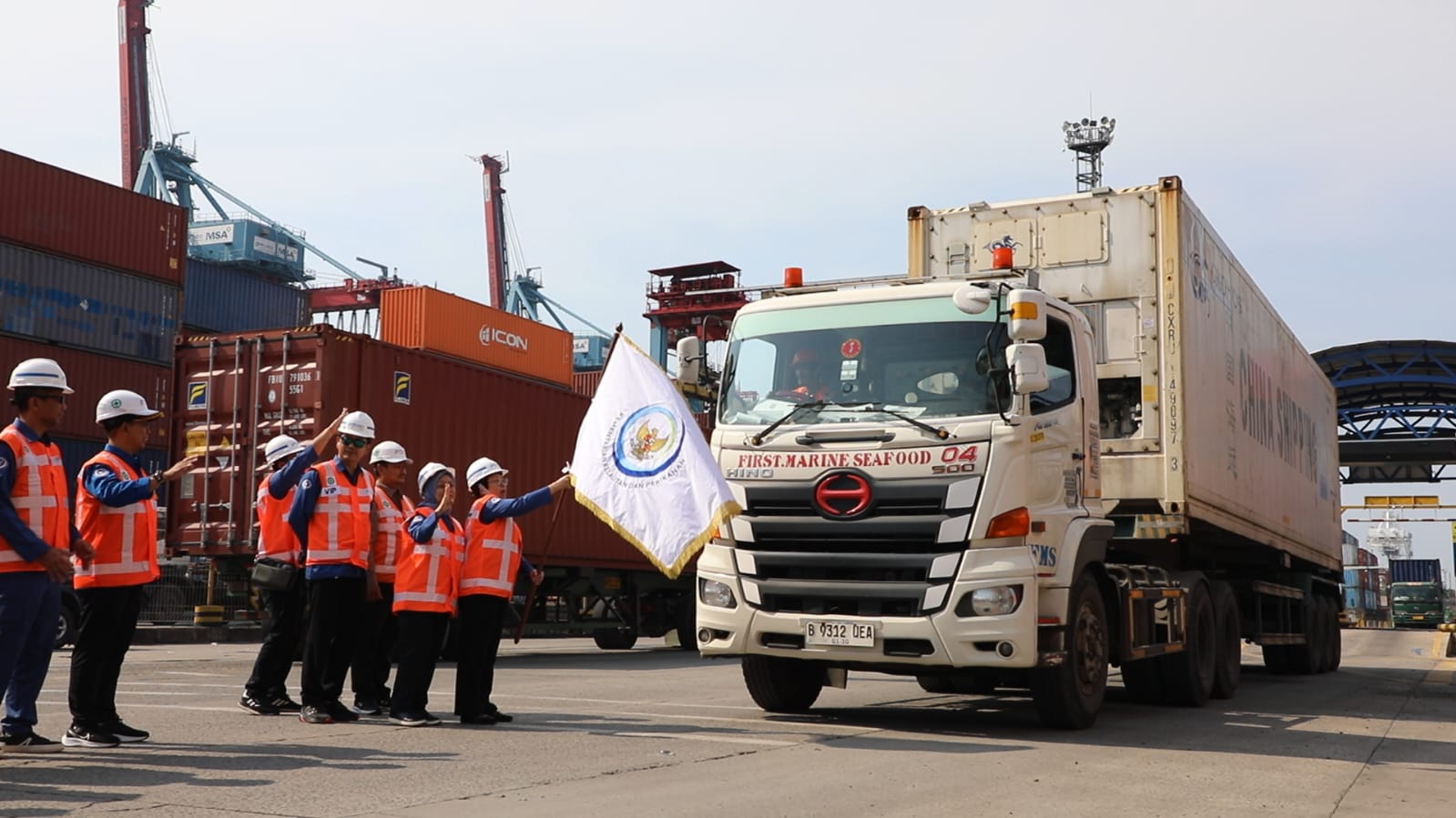 Caption : Kepala Badan Mutu KKP Ishartini (memegang bendera) melepas perdana ekspor udang bebas Cesium-137 ke Amerika Serikat (AS) beberapa waktu lalu yang menandai kembalinya udang Indonesia di pasar AS setelah mengalami hambatan karena isu kontaminasi bahan radioaktif.