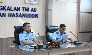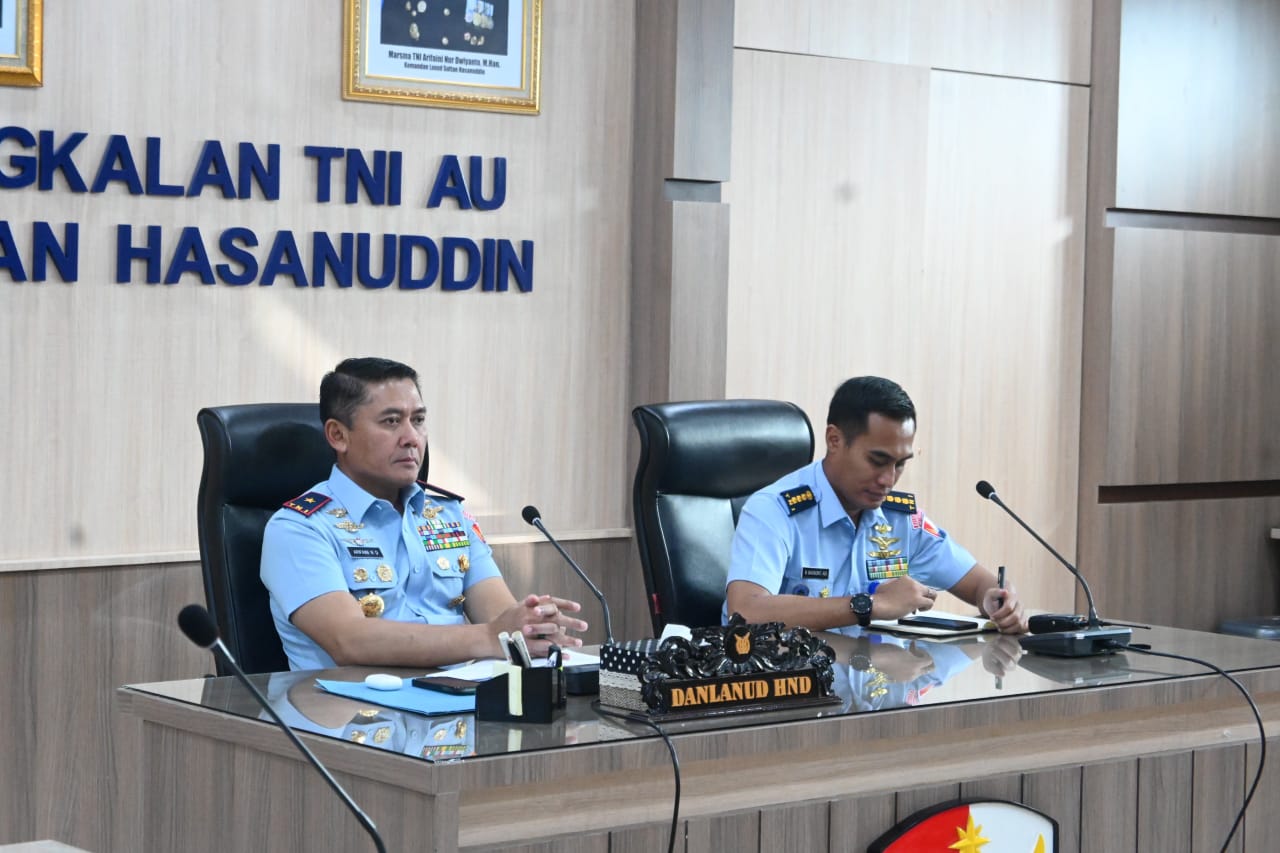 Makassar – Danlanud Sultan Hasanuddin Marsma TNI Arifaini Nur Dwiyanto, M.Han., didampingi para pejabat Lanud Sultan Hasanuddin mengikuti Rapat Kerja Teknis (Rakernis) Komando Daerah TNI Angkatan Udara II (Kodau II) secara virtual di Ruang Rapat Mako Lanud Sultan Hasanuddin, Senin (23/2/2026).